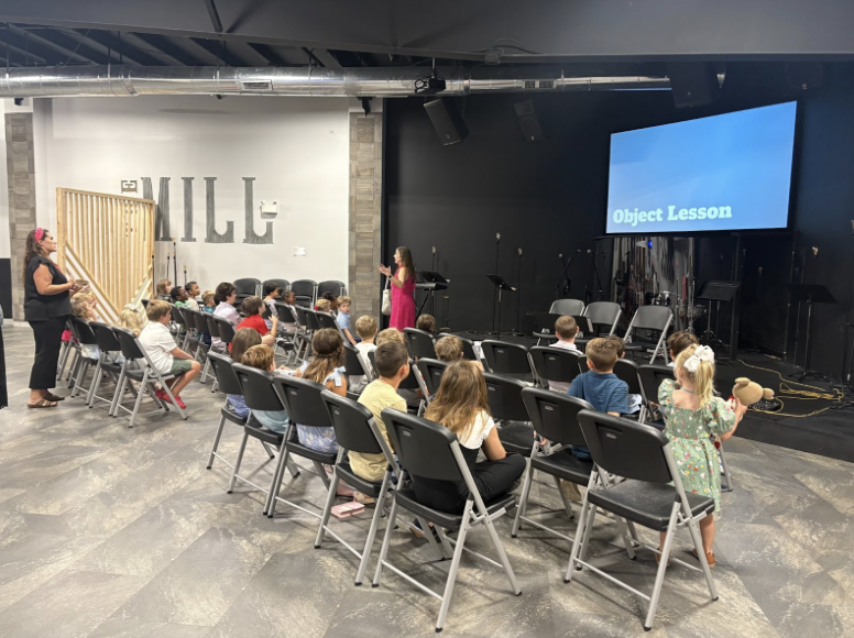 - Children begin in the main worship service and are dismissed about 20 minutes in to The Mill room upstairs